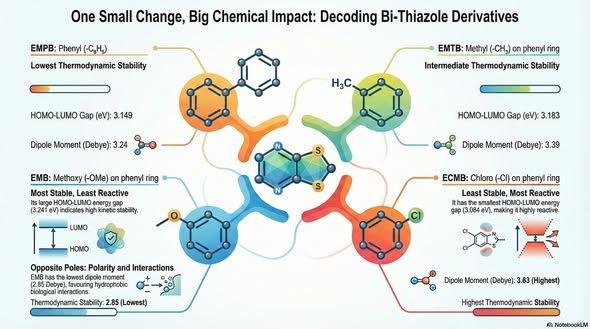 Thiazole and bi-thiazole-based compounds’ vital role in broad-spectrum biologicalactivities attracts immeasurable research interest to investigate their molecularcharacteristics. This work aims to explore the molecular insights of bi-thiazolecompound ethyl 2’-(4-methoxyphenyl)-4’-methyl-2-phenyl-[4,5’-bithizole]-5-carboxylate (EMPB) and its methyl, methoxy and chloro derivatives such as EMTB,EMB, ECMB. B3LYP hybrid functional at the 6-31+G(d,p) basis set level theoryimplemented to get molecular geometry features, charge density distributionand insights into physicochemical properties.